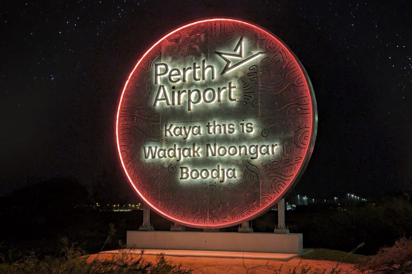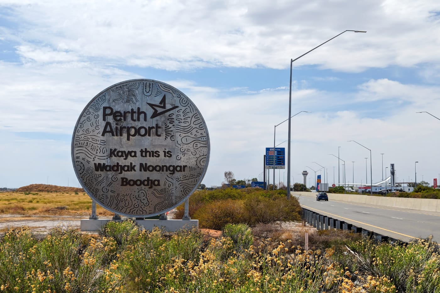 A textural metal canvas showcases the beautiful work of emerging local Noongar artist Jarni McGuire, laden with symbology and markings that represent the story of the land and Noongar culture. These are cut into six metre wide panels of stainless and corten steel that nod to the warm earthy reds and cool steely granite of the West Australian landscape. This inspiration was important, to create a natural palette with high contrast to ensure the signage complements but doesn’t compete with its surroundings. Floating over the textured circular backdrops are the words that welcome inbound visitors to Perth or outbound travellers to Perth Airport depending on your approach. The careful choice of both Noongar and English words provides an opportunity for many, to self-learn the words Hello – Kaya. and identify the traditional land – Wadjak Noongar Boodja.