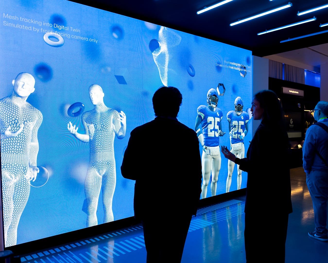 To bring the brand’s technology to life, we created a hosted “GeniusIQ Showcase.” Upon arrival, guests were guided through a fully immersive simulation that turned each investor into a life-sized mesh clone before seamlessly transitioning their reflection into a 3D “digital twin” of an American Football player. This experience illustrated how in-stadium cameras compute movement on-device to build a digital version of the game, reducing latency and unlocking new revenue streams.